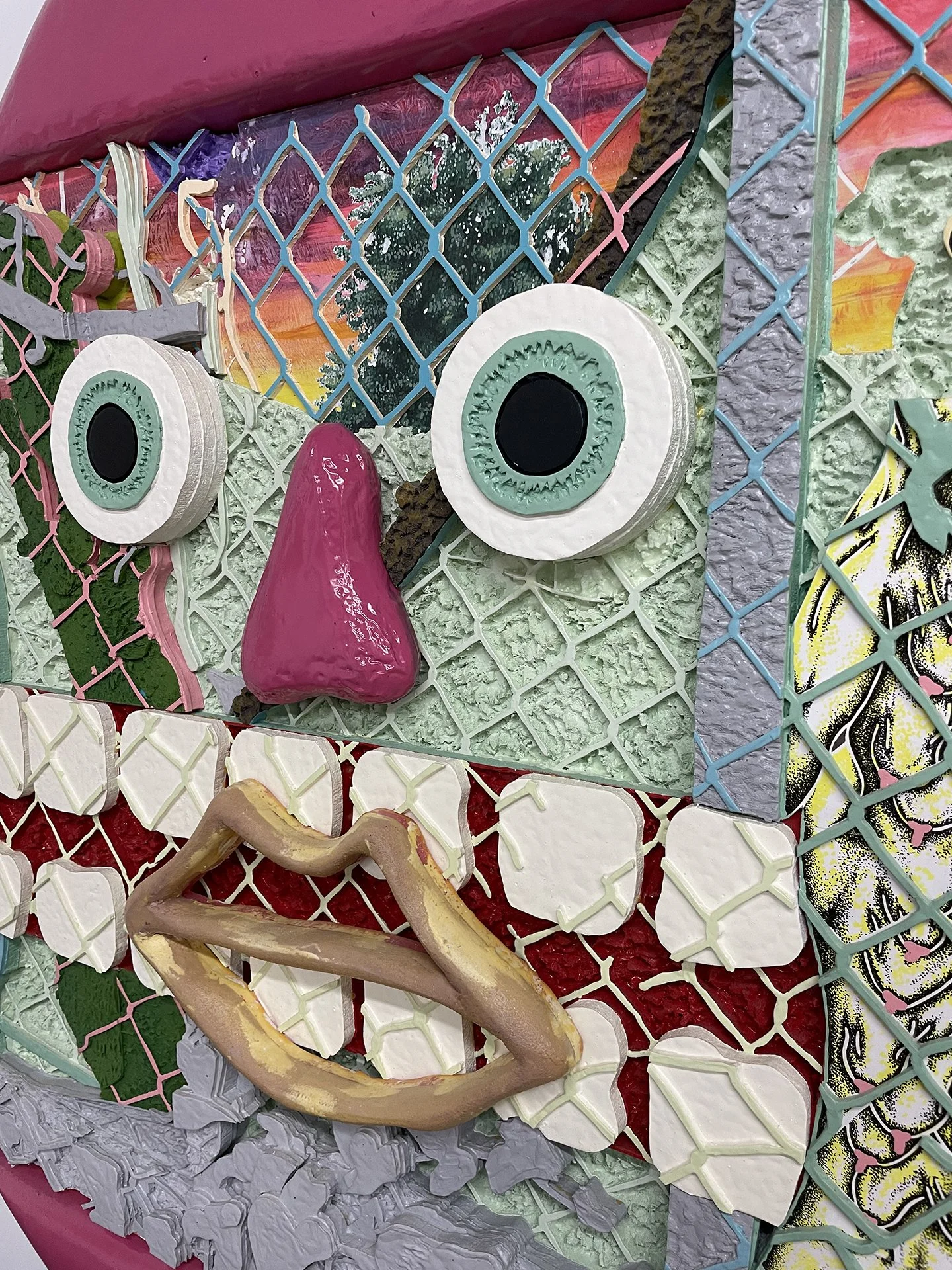 Acrylic and ink on paper, carved polystyrene and wood panel with XPS foam, wood glue, joint compound, fiberglass resin, spray paint, wood dowels and polyurethane