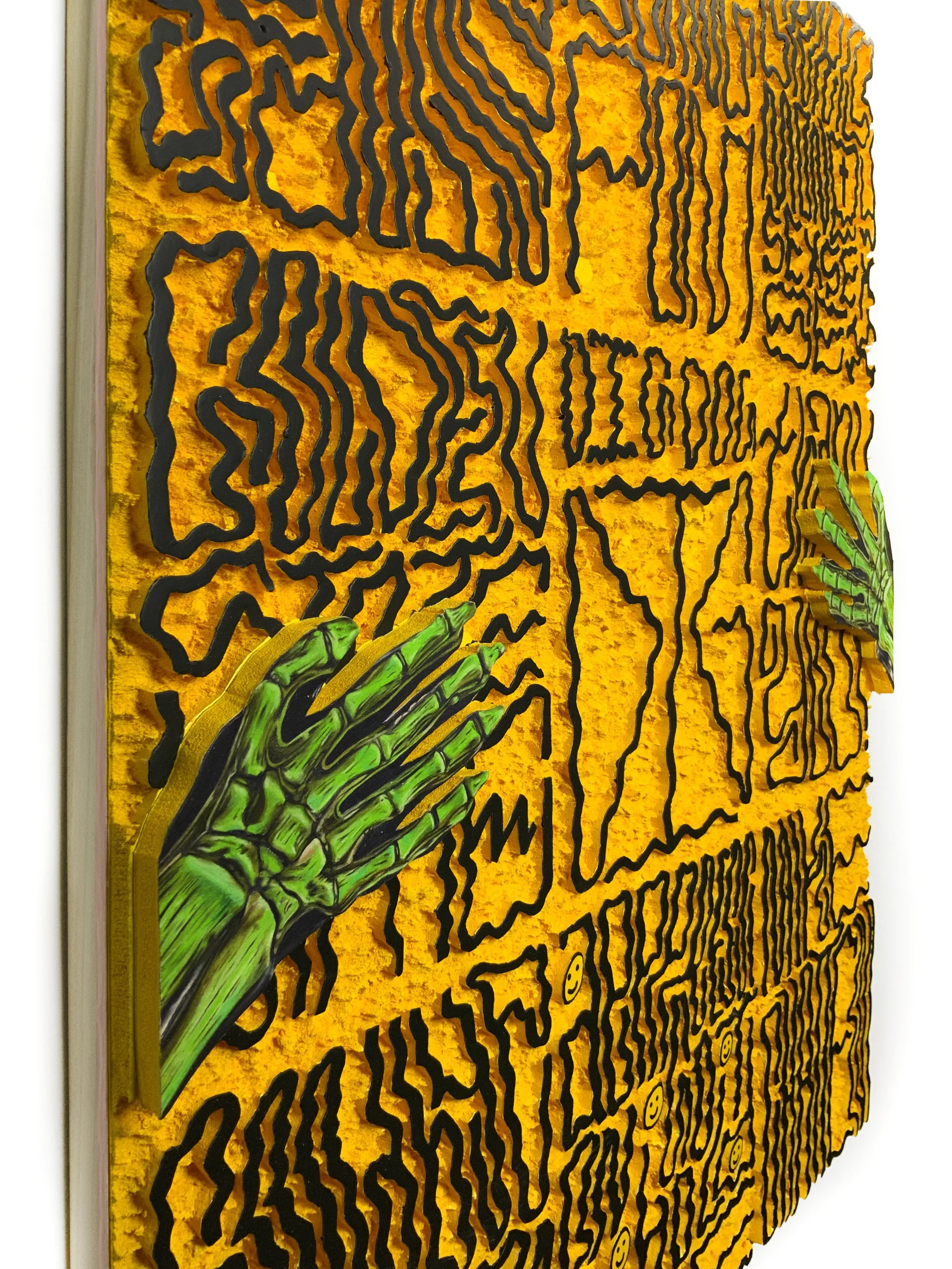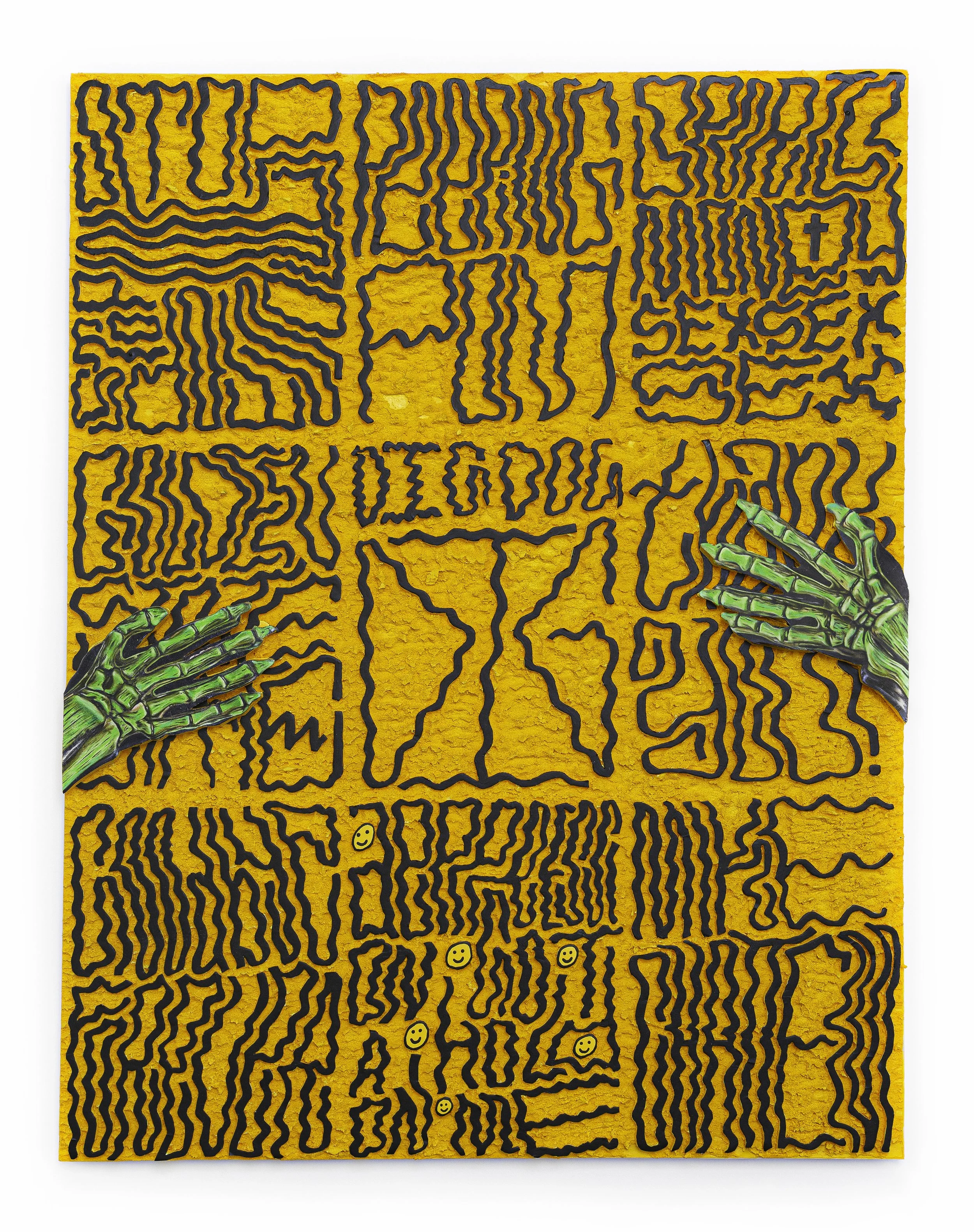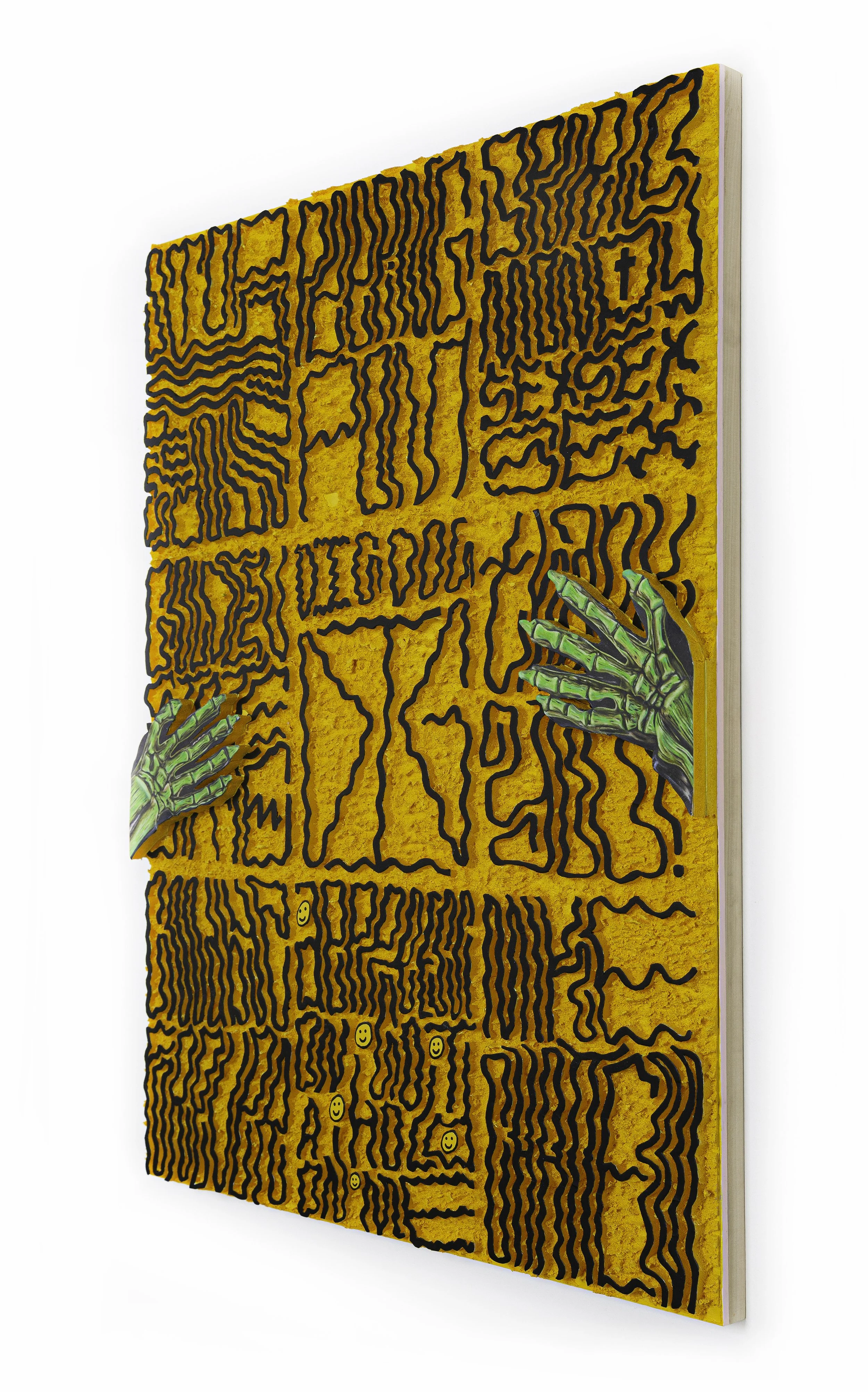 Acrylic and colored pencil on paper and carved polystyrene mounted to panel